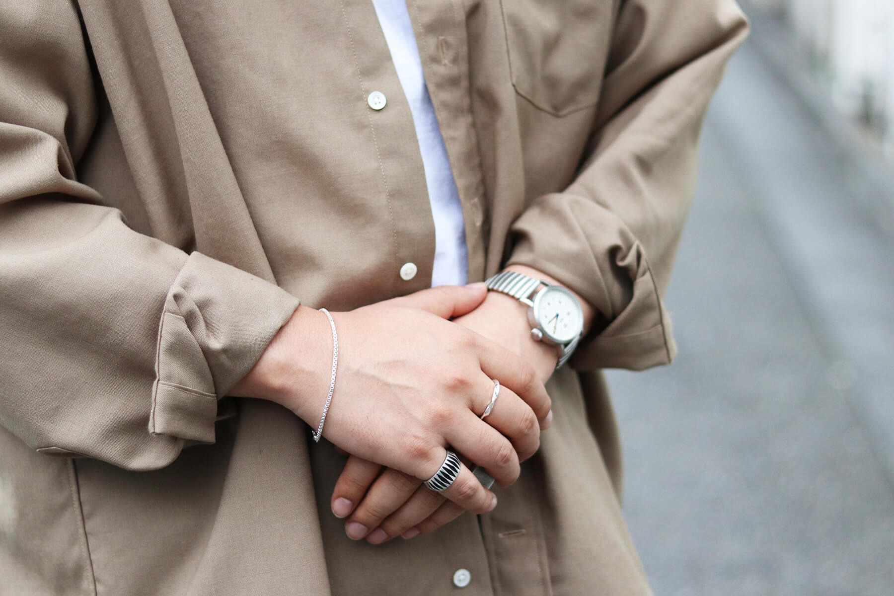 素材はオールシルバーなんですが、凸凹部分にちょっとしたこだわりが。”燻し加工”を施す事でvintage感をほんのり感じる風合いにしてみました。