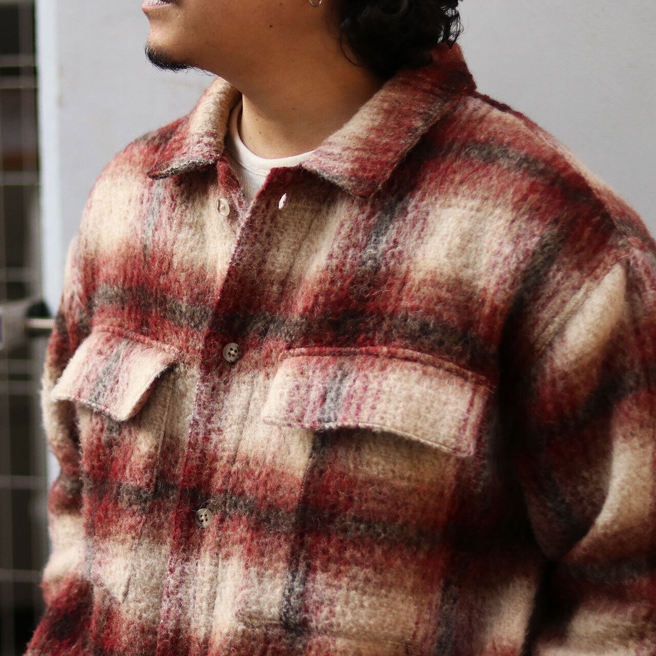 若干深めな赤を基調とした、赤・白・黒の割合が丁度いい塩梅の3カラー構成。シャギーの素材感も相まって『THE 赤』『THE白』という感じではなく、ぼんやりとした色合いに。「普段色をあまり使わない」という人でも抵抗なく着れるような仕上がりになっています。